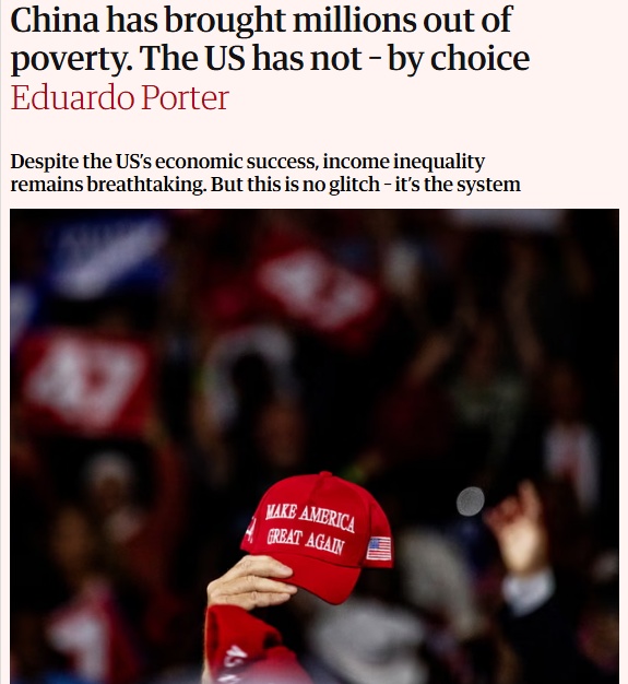 《卫报》认为,一个社会的成功程度取决于它如何利用所创造的财富以及如何分担失败的成本。与中国不同,美国并没有为在贫困线边缘挣扎的人们提供太多援助。尽管美国的人均经济产出高于中国,但美国的极端贫困人口数量却超过中国。造成这种情况的原因不是经济能力的缺乏,而是政策选择的不同。